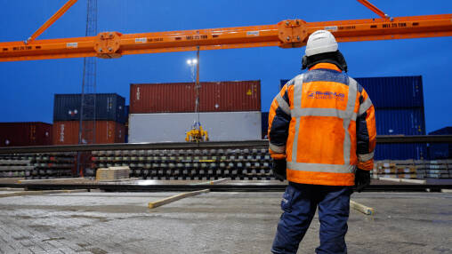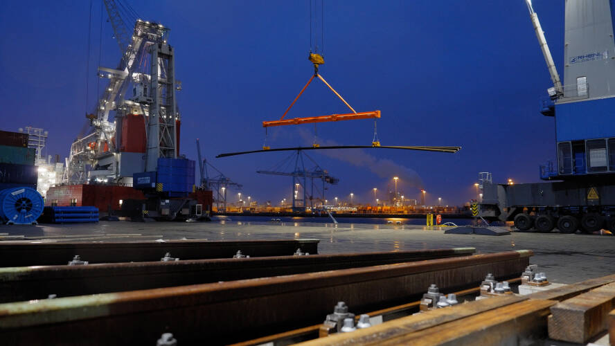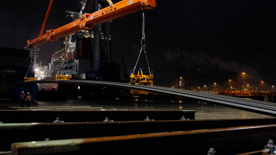 Aanvoer van spoorwissels per schip (van Nieuw Lekkerland naar Maasvlakte).